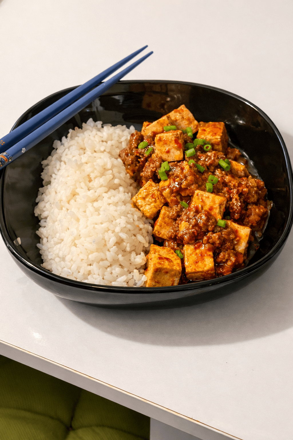 Yumuşak tofu küpleri, dana kıyma ve acı-umami dengesi yüksek bir sosla pişirilir.