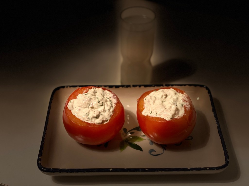 Geçtiğimiz pazar akşamı evde rakı sofrası kurarken, dolapta duran birkaç malzemeyle hızlı bir meze hazırlamak istedik. Büyük ve sulu domateslerin içini boşaltıp ton balığıyla doldurunca ortaya hem görüntüsü güzel hem de oldukça ferah bir meze çıktı.